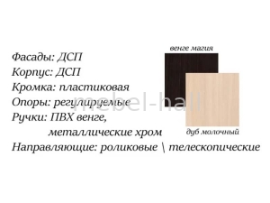 Фасад выполнен из ламинированного ДСП Дуб Молочный и Венге Магия.