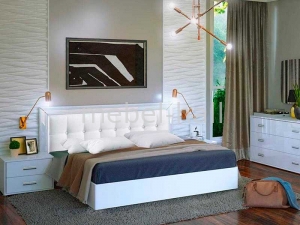 В комплект спальни входит двуспальная кровать с размером спального места 160 х 200 см. Выполнена со сплошной мягкой спинкой, похожей на большую подушку. Ткань изголовья очень легка в уходе и устойчива к перепадам температуры.