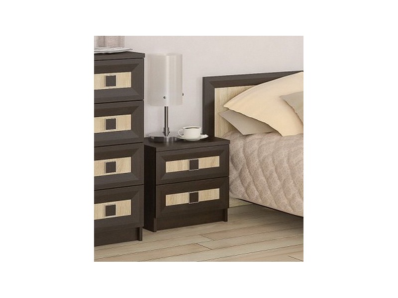 Все фасады элементов спальни Даллас выполнены из ламинированного ДСП в цвете Дуб Самоа с накладками из МДФ в цвете Венге темный.