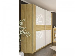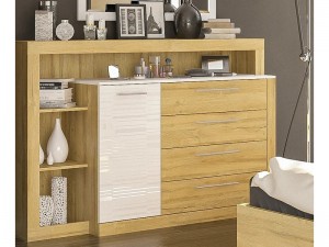 Все фасады элементов спальни Фиеста выполнены из ламинированного ДСП в цвете Дуб Золотой с вставками из ламинированного ДСП в Белом цвете с выборочным лакированием.