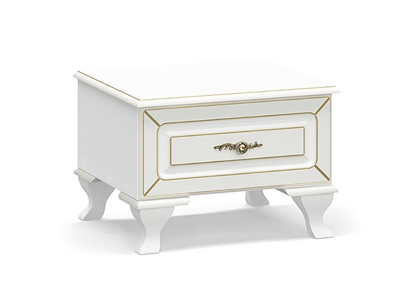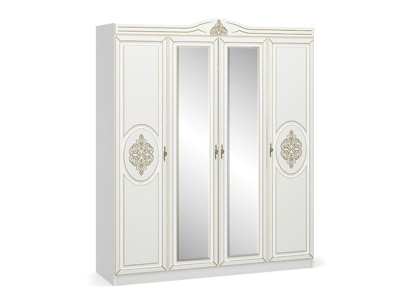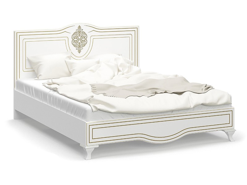 Все фасады элементов спальни Милан выполнены из МДФ в Белом цвете с применением технологии патинирования золотом.