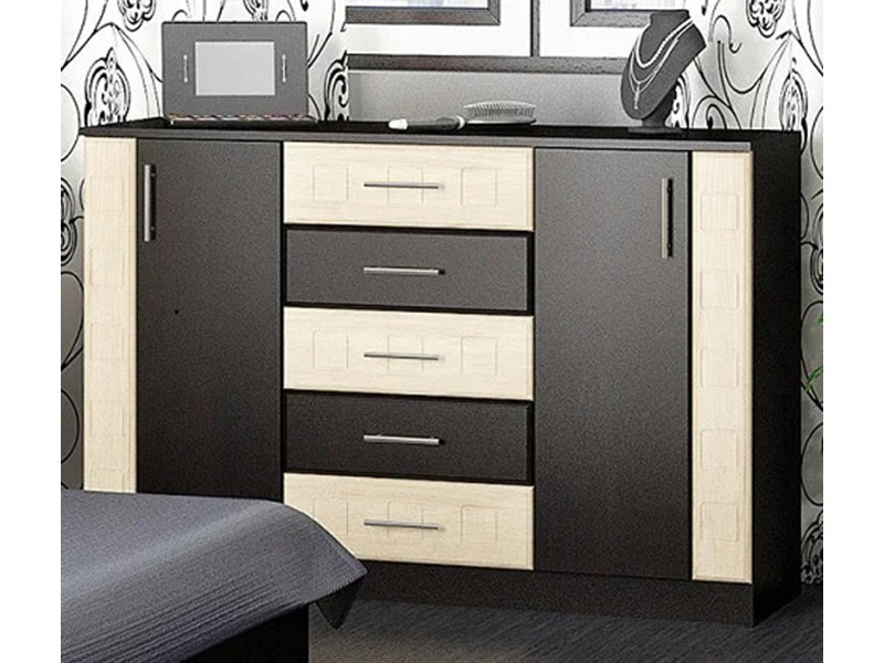 Корпус элементов спальни София выполнен из ламинированного ДСП в цвете Венге темный.
