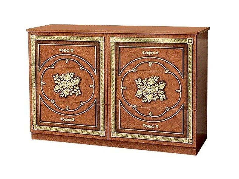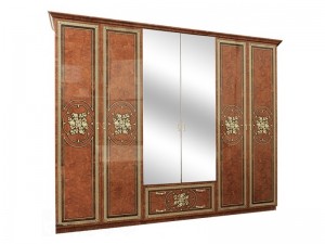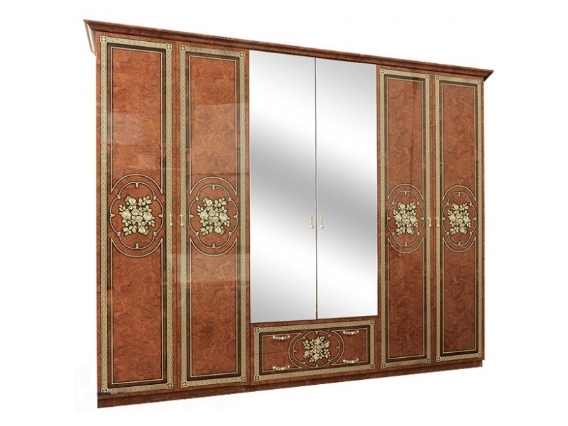 Спальня Жасмин с шестидверным шкафом Світ Меблів Пино Орех от украинской фабрики "Світ Меблів". Классическая спальня в итальянском стиле, характеризуется изысканным дизайном, роскошными формами с изящной декоративной резьбой и оригинальными ручкам, сочетающиеся с художественной росписью на фасадах. Модель оснащена выдвижными ящиками на направляющих полного выдвижения, что гарантирует плавность при выдвижении и долговечность. Спальня Жасмин достойна королевских апартаментов.