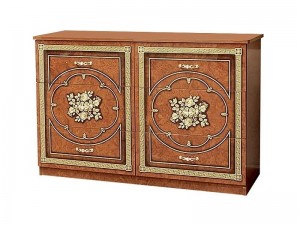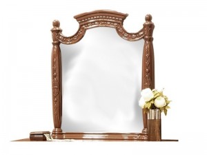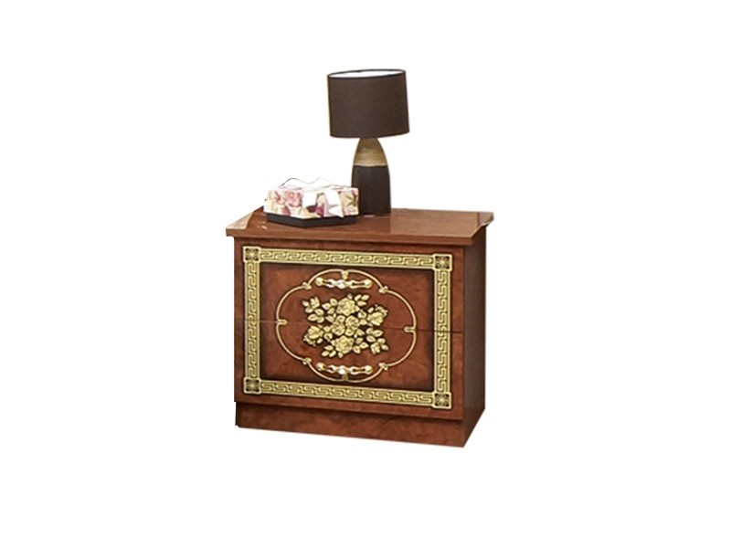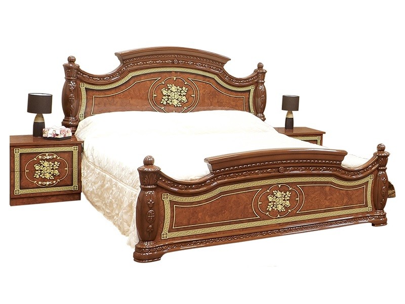 Все фасады элементов спальни Жасмин отлакированные, выполнены из ламинированного ДСП в цвете Пино Орех Лак + Художественная Печать + Декоративная Резьба в цвете Пино Орех.