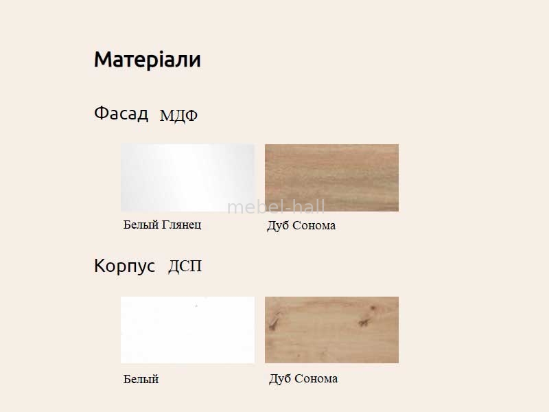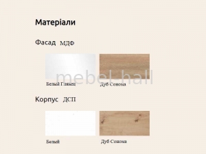 К особенностям серии Бьянко относят декоративные вставки из ДСП в цвете дуб сонома и удобные продолговатые ручки из металла.