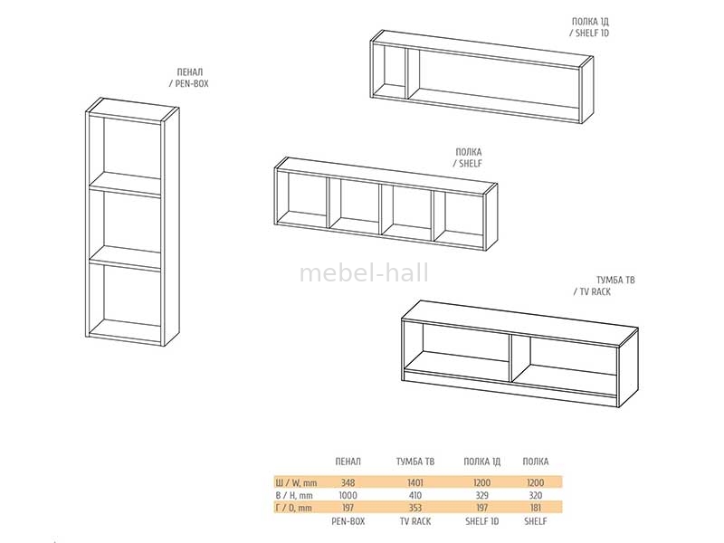 - Пеналы навесные 1-о дверные, с тремя полками для вещей.