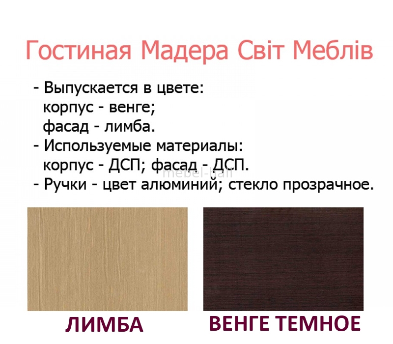 Гостиная Мадера - изящная стенка в гостиную, которая включает в себя навесные полки различной высоты, шкаф с стеклянной дверью, ниши с дверцами и просторной нишей для ТВ. Фасад и корпус сделаны из специального ламинированного ДСП. Для окраса корпуса используют такие цвета: тёмный венге, лимба.