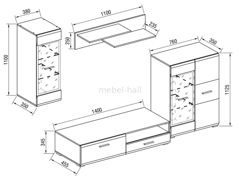 1) Тумба под ТВ - размеры: 140*345*455 см(1 шт)