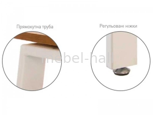 Каркас и ножки стола изготовленного из металла в виде прямоугольной трубы, окрашенной в серый цвет. Высота ножек регулируется для установки на неровной поверхности пола.