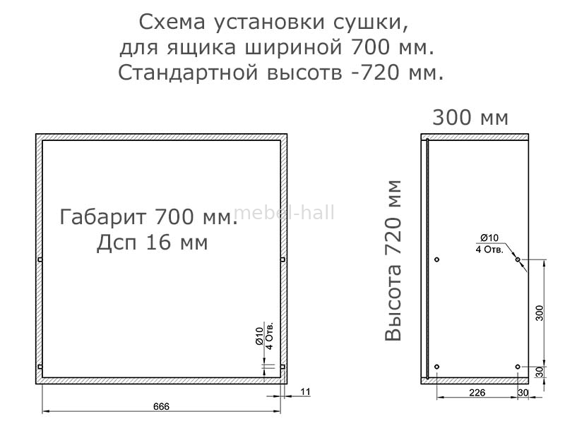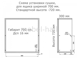 Сушка может монтироваться в мебель с толщиной боковых стенок как 16 мм, так и 18 мм.