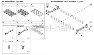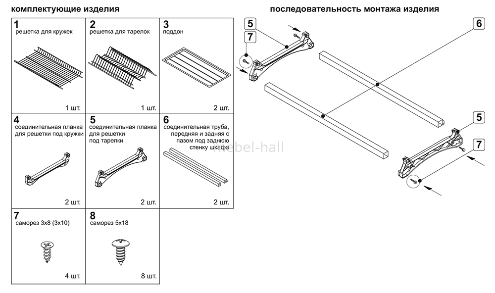 Сушка может монтироваться в мебель с толщиной боковых стенок как 16 мм, так и 18 мм. Комплект сушки включает 2 яруса для хранения посуды с надёжным гальваническим покрытием с эффектом хромирования, 2 съёмных поддона из качественного бесцветного пластика, 4 пластиковых серых держателя нижнего и верхнего уровней, переднюю и заднюю алюминиевые трубки, винты для монтажа сушки и крепления трубки.
