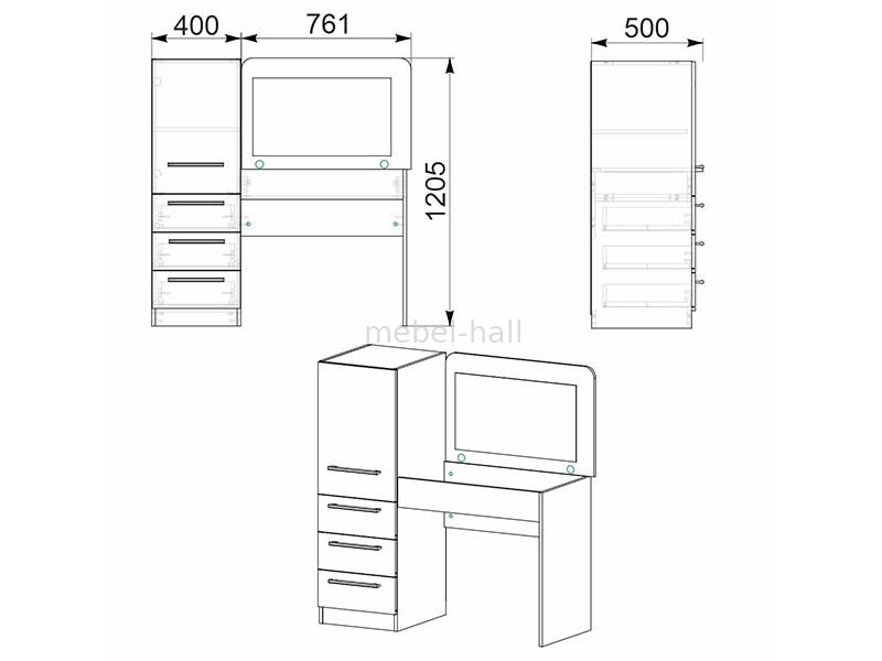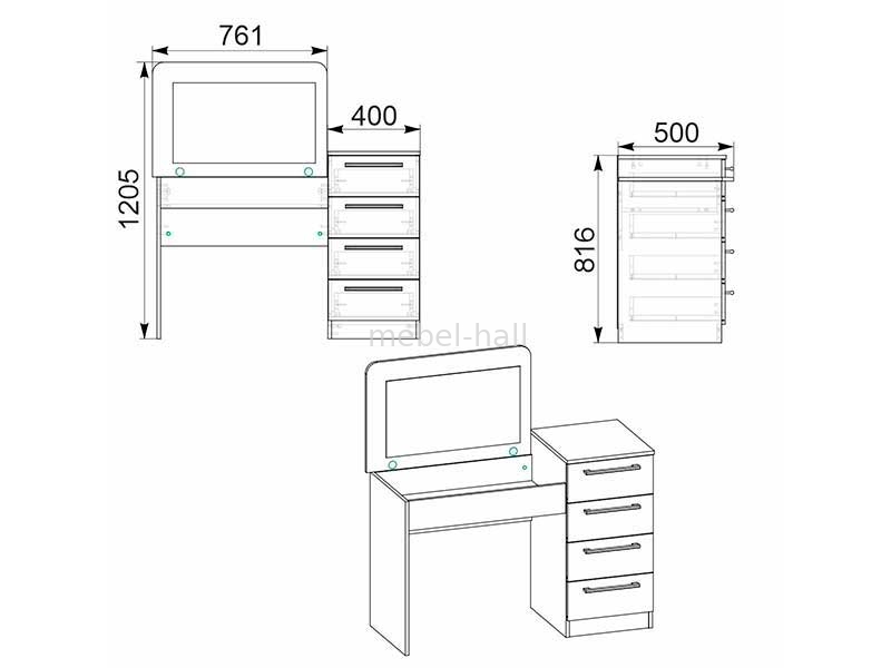 Материал: корпус трюмо изготовлен из ламинированного ДСП, кромка ПВХ, фасадная часть выполнена из ламинированного ДСП, задняя стенка ДВП.