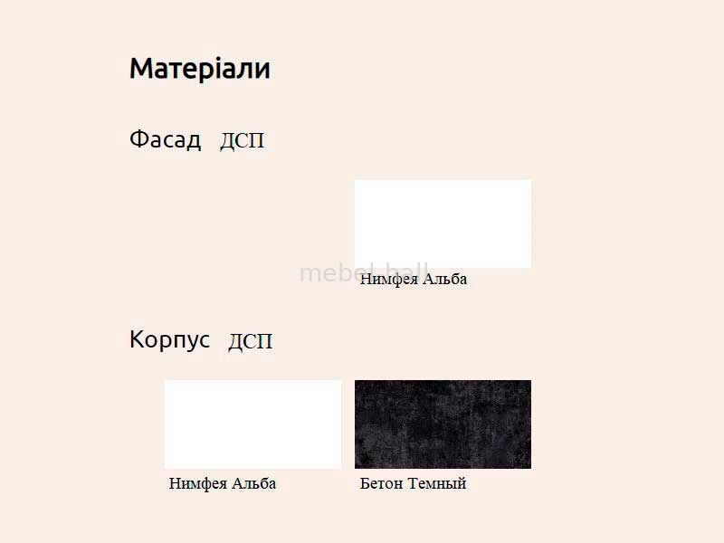 Фасад выполнен из ламинированного ДСП Нимфея Альба / Бетон Темный.