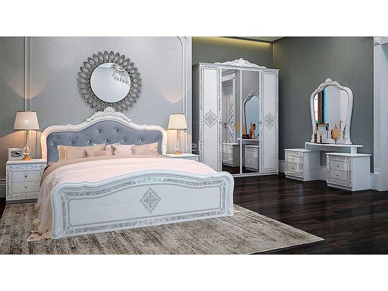 Модульная мебель для спальни в классическом стиле в белом глянце с художественной печатью от украинской мебельной фабрики MiroMark. Современный дизайн, металлические круглые ручки, помогут оформить стильный интерьер спальной комнаты.