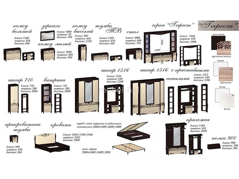 Мебель Гефест включает в себя большое количество идеально гармонирующих друг с другом модулей для создания идеального интерьера гостиной, спальни, детской или прихожей.