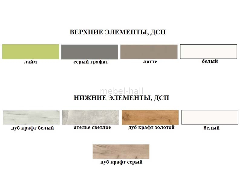 Для верхних секций предлагается 4 цвета фасадов на выбор: Лайм, Серый Графит, Латте, Белый.