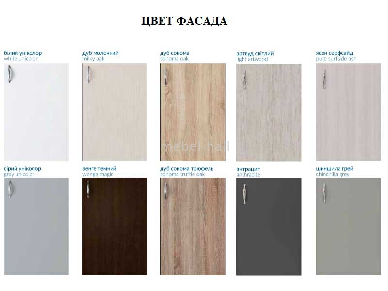 | Цвет фасадов: | Дуб Сонома Трюфель, Шиншилла Грей, Антрацит, Ясень Серфсайд, Артвуд Светлый, Серый Униколор, Дуб Молочный, Венге Темный, Белый Униколор, Дуб Сонома |