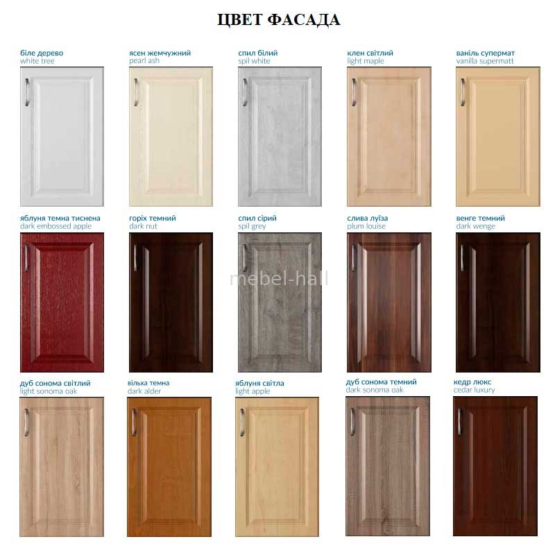 | Цвет фасадов: | Белое Дерево, Дуб Сонома Темный, Кедр Люкс, Слива Луиза, Спил Серый, Дуб Сонома Светлый, Ольха Темная, Ваниль Супермат, Спил Белый, Орех Темный, Яблоня Темная Тисненая, Яблоня Светлая, Клен Светлый, Ясень Жемчужный, Венге Темный |