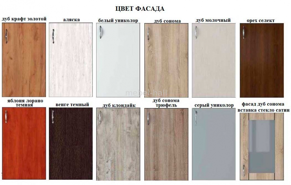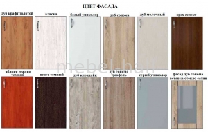Фасады изготовлен из ламинированного ДСП 16 мм высокого качества в 11 цветах с древовидным декором.