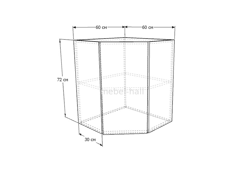 Угловой закрытый верхний шкафчик витрина ВТ-60х60х72 В с одной дверью и полкой внутри.