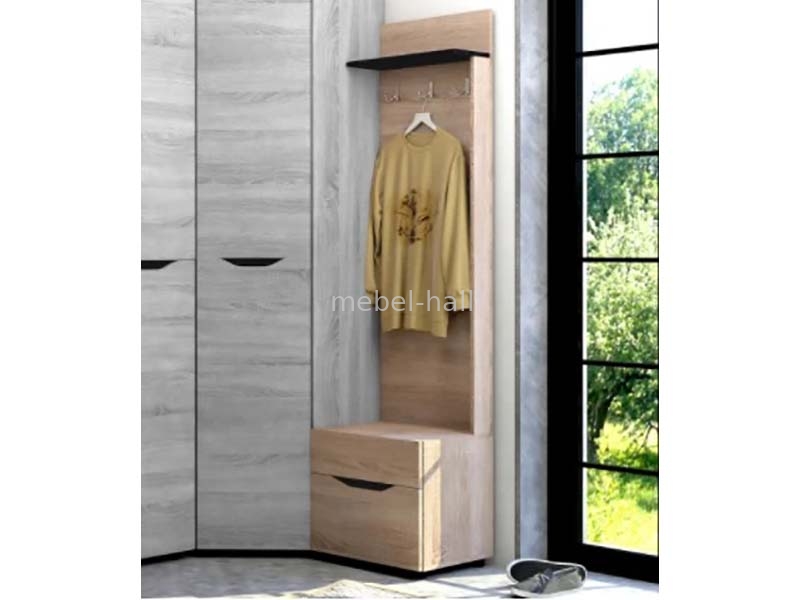 Компактные размеры вешалки, наличие крючков и полки, выдвижного ящика и отделения для обуви, позволят разместить ее в небольшой прихожей.
